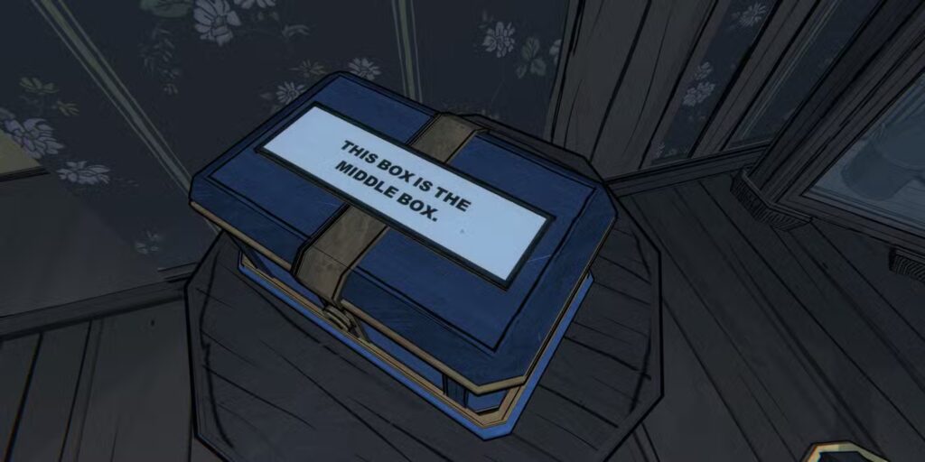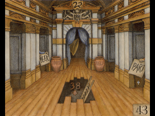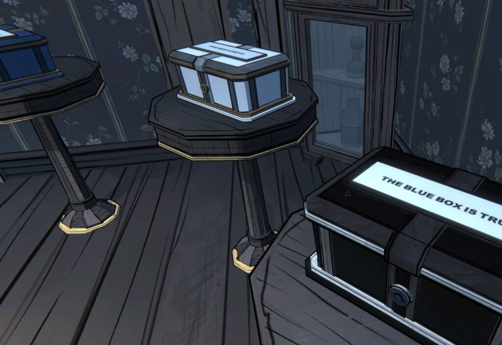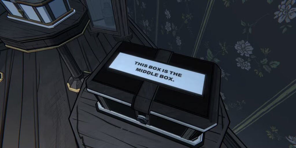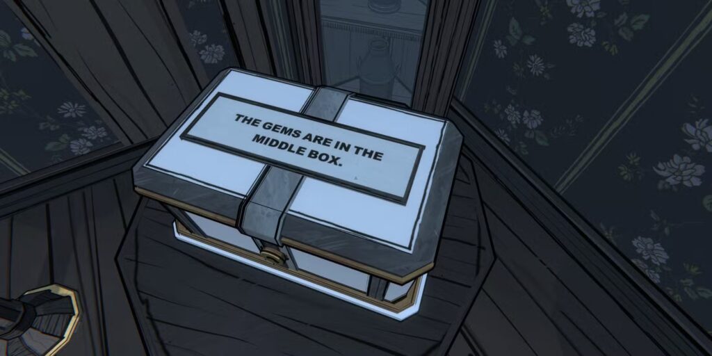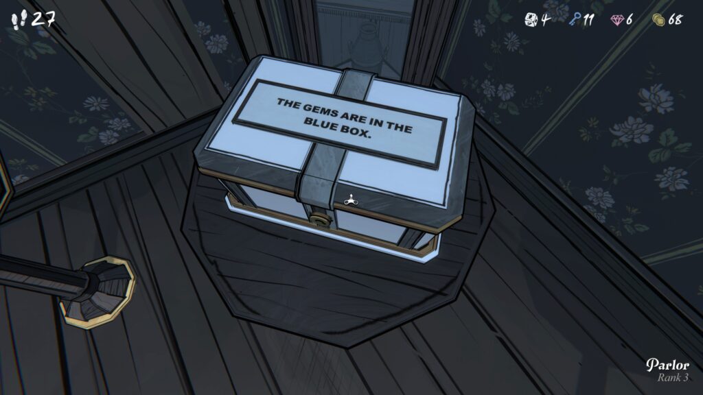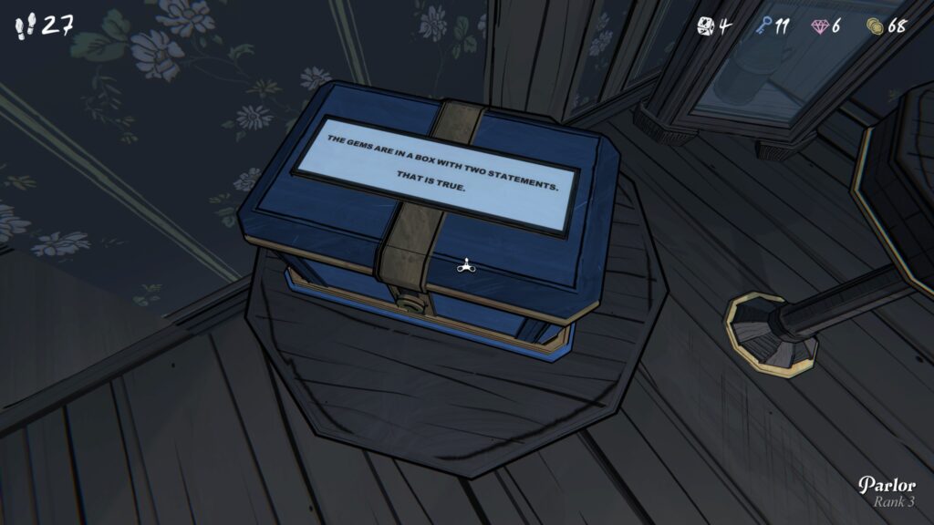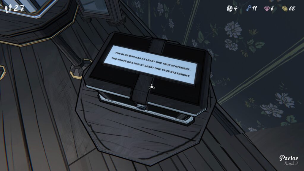 Есть целые классы похожих задач, но даже они не повторяются, а становятся интереснее со временем. Приведу один пример. В игре есть комната под названием Parlor, в которой вам задают классические смаллиановские задачки про три ящика. На столе стоят три сундука, на одном из которых только верные утверждения, на другом только ложные, а на третьем может быть всё что угодно. В одном из сундуков бриллианты, и вам дают одну попытку открыть правильный сундучок.