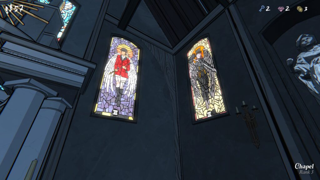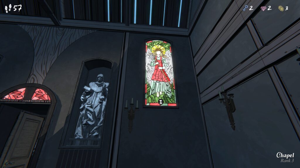 Загадки в Blue Prince великолепные. Я когда-то в другом обзоре восхищался игрой Lorelei and the Laser Eyes, так вот, тут ещё интереснее получается. Они очень разнообразные, но, к сожалению, об этом очень сложно рассказывать без спойлеров, потому что часто важная часть задачи состоит в том, чтобы понять, чего от тебя хотят. Вот на стенах часовни картины, которые очевидно здесь не просто так… но зачем они нужны, ты догадаешься часов через пятнадцать: