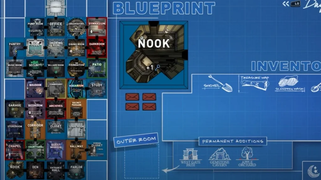 Blue Prince — это гибрид жанров, который Рос называет “архитектурным приключением”. По сути, это квест от первого лица с элементами roguelike и стратегии. От приключенческих игр здесь взято исследование локаций и решение головоломок в рамках глобальной прогрессии, от рогаликов — концепция забегов, процедурное порождение и метапрогрессия.