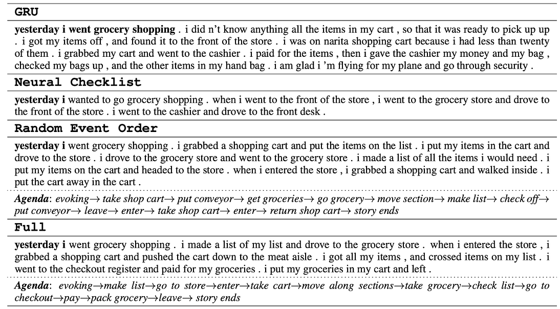 Let’s see what kind of stories this model can generate. Here is a comparison of several approaches, with the full model in the last place. It is clear that the full model is indeed able to generate the most coherent story that best adheres to the agenda: