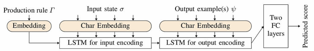 The search-based direction was continued in (Vijayakumar et al., 2018), another publication affiliated with Microsoft Research. There, the authors go back to the string transformation domain and use neural networks to specifically predict how to expand the current node, with an LSTM-based model like this: