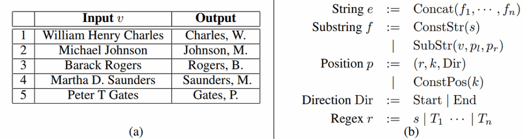 But today, we will be talking about a different problem setting sometimes called Programming by Examples (PBE), whereby a program is derived from a set of its sample results and input-output pairs. The deductive approaches pioneered by Manna and Waldinger are alive and well in PBE: for instance, the field was largely initiated by Sumit Gulwani’s paper called “Automating String Processing in Spreadsheets Using Input-Output Examples”. In this paper, Gulwani defined a formal language for string manipulation that is, on the one hand, expressive enough to be useful, and on the other hand simple enough to be amenable to PBE.