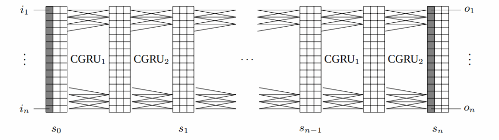 Another successful take on program induction is the construction of Neural GPUs (Kaiser and Sutskever, 2015). They note that neural Turing machines are hard to train due to their inherently sequential nature: NTMs try to mimic Turing machines that are regular sequential computers with very limited computation done on each step. But programs with a lot of steps (i.e., any realistic ones) are very hard to train in this way. Neural models are much more suitable for GPU-like computation, a relatively short sequence of highly parallelized and powerful computations. The architecture is based on applying a sequence of convolutional GRUs, a radically simpler idea that can be compared to regular or stacked RNNs rather than involved architectures such as the neural Turing machine. See below: