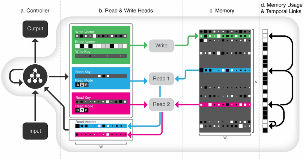 The next development by Graves et al. came in 2016, when they developed NTMs into a differentiable neural computer (DNC), an architecture featured in Nature (Graves et al., 2016). They added temporal links that are able to tell which memory cells have been written to earlier or later and memory usage information that can inform the controller about memory state in a more direct and simple way. The resulting architecture (shown below) is able to learn simple programs even better, although training it is even harder.
