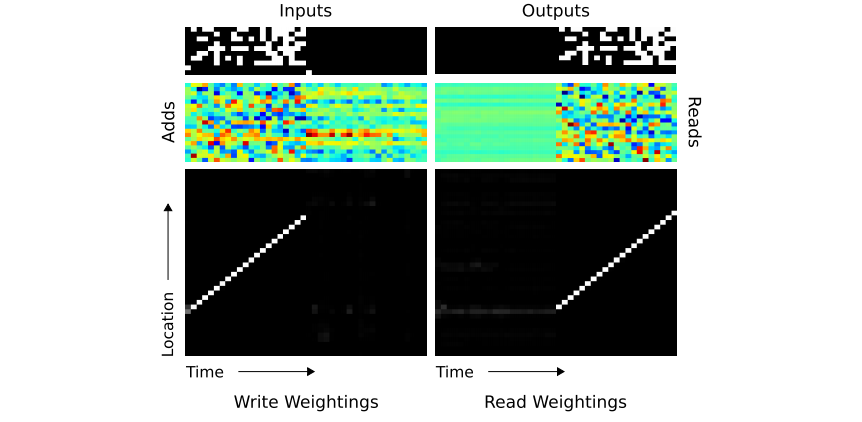 Graves et al. showed that the NTM architectures, especially with recurrent (LSTM-based) constructions, are able to generalize well, learning the ideas of programs from examples. For instance, an NTM trained to copy a vector from input to output (after a delimiter is seen, so you have to store the sequence in memory before writing it out) was able to generalize from examples of length 20 and then copy sequences of length up to 120. And if you look into what the NTM has learned to do, it indeed looks like a simple algorithm for manipulating arrays: first read the input cell by cell into memory, then read the memory cells one by one, copying them to the output tape. Here is a map of memory use for reading and writing:
