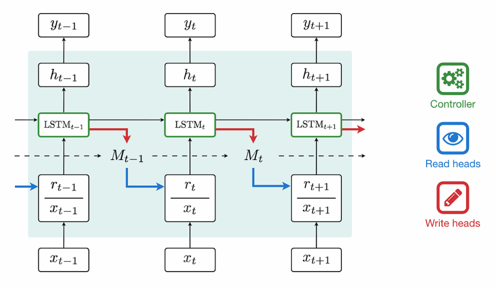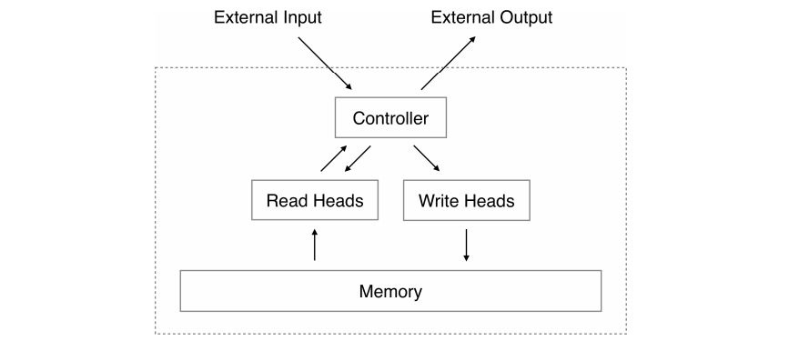 The idea of Graves et al. was to use neural networks to operate with external memory, which, similarly to Turing machines, is formalized as a “tape” or a set of memory locations. The neural network serves as a controller, telling the basic architecture what to read from memory, what to write there, and what to output to the environment.