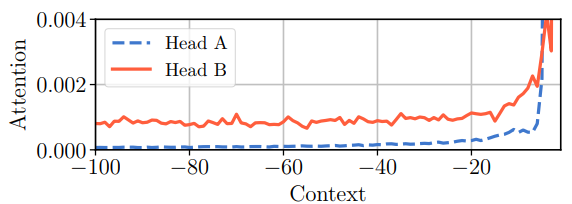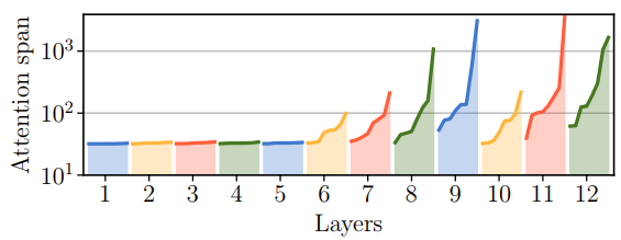 The authors compare their models with regular Transformer-based networks and show that they can achieve the same or even slightly better results on held-out test sets with significantly smaller models. Another interesting observation is that in the resulting models, the early layers almost universally use very short attention spans, and only the later layers (say, layers 8–12 in a 12-layer model) can make good use of long contexts. Here are two examples: on the left, we see head B in a regular Transformer caring about much shorter context than head A; on the right, we see the actual attention spans across various layers: