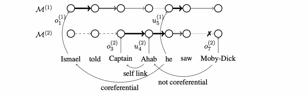 In this work from Facebook Research, Fei Liu et al. (ACL Anthology) tackle the hard and interesting problem of anaphora resolution, that is, which concept or previously mentioned word/phrase does a given pronoun refer to? It (please resolve my anaphora here) is an interesting problem, and actually even the very best models are still far from perfect at this task — getting anaphora resolution right in corner cases would require some deep knowledge about the world. The authors present the so-called Referential Reader model: it identifies entity references and stores them in a fixed-length memory, with the update and overwrite operations for the memory available for the model. The memory is controlled with a GRU-based language model, with special saliency weights showing which memory cells are still important and which are safe to overwrite. So, in the example below, we first store the “Ismael” in the first cell and increase its saliency, then overwrite the second cell (with low saliency) with “Captain Ahab” (first “captain”, then updated with “Ahab”), and then resolve the “he” reference by choosing the first memory cell contents: