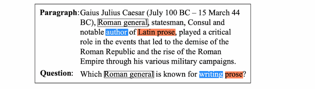 In this example, an attention-based model will try to learn an alignment between words in the question and in the paragraph. If you have a huge dataset and a large model, then, of course, mapping “author” to “writing” can occur naturally. If not, however, it is much easier if the network has some way to, e.g., align words that are labelled as similar in some knowledge base. Such knowledge bases, of course, exist and are readily available for most languages.