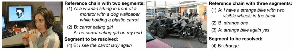 And the last paper of the day was by Janosch Haber et al. (ACL Anthology). This dataset concentrates not on captioning, but on visually-grounded dialogue, i.e. conversations . The authors argue that one important reason why dialogue is hard is because the participants rely on their shared knowledge and shared linguistic experience that they build during the conversation, and current dialogue models still cannot really capture this “common ground”. So their proposal is to create a dataset where the grounding is not only conversational but also visual. This is implemented as a game: two participants see six photos each, and they need to find out in dialogue which of the three highlighted photos they have in common (some of them are the same and some are different). They do it in natural dialogue, and the visual domain is controlled too, so the images are sufficiently similar to require an in-depth description from the participants. Here is an example: