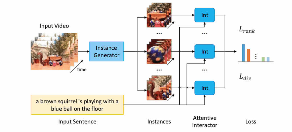 To solve the problem, the authors use a pipeline with a standard Faster R-CNN object detector to generate bounding box proposals (Instance Generator below), an “Attentive Interactor” module that unites RNN-produced representations for the text and the proposed regions, and then the whole thing is trained with a ranking loss and a diversity loss with multiple instance learning. Here is the whole pipeline: