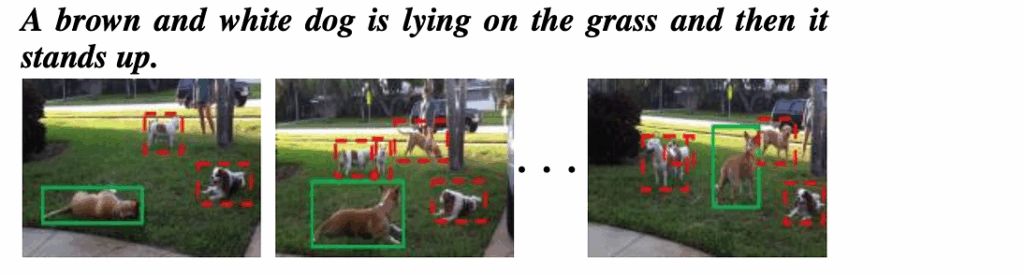 Traditional video grounding is the problem of localizing a spatial region in certain video frames that corresponds to a specific part of a natural language query (say, find the part of the “spatio-temporal tube”, i.e., the video tensor, that corresponds to a coffee cup). This, however, requires dense fine-grained regional annotations in the video, which are very hard to obtain, so this work by Zhenfang Chen et al. (ACL Anthology) considers weakly supervised video grounding. Moreover, they move to the general problem of localizing a spatio-temporal tube that corresponds to a given sentence as a whole, not to a specific noun. They call this problem weakly-supervised spatio-temporally grounding sentence in video (WSSTG); like this: