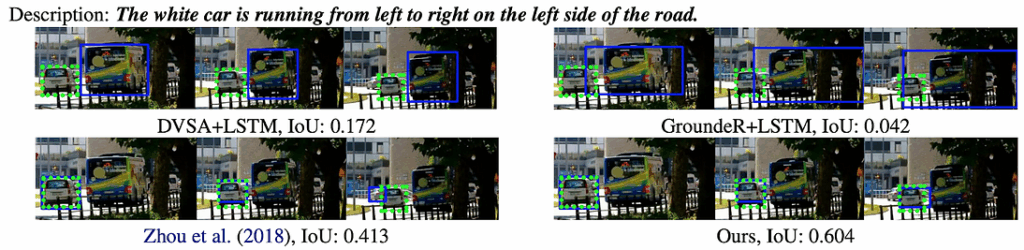 The authors also collect and present a new dataset designed for this problem, with videos where some target regions are annotated with sentences. There is nothing too sensational in this approach, but, as often happens with modern deep learning models, it is a big surprise that it actually does work! The resulting model can correctly understand quite complicated queries. Here is a sample comparison from the paper:
