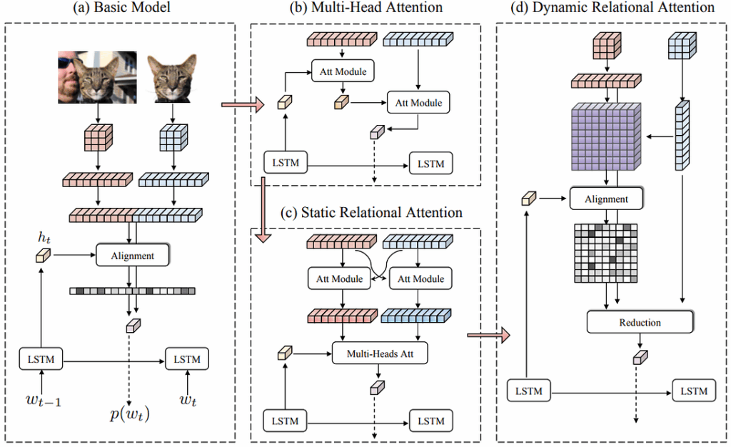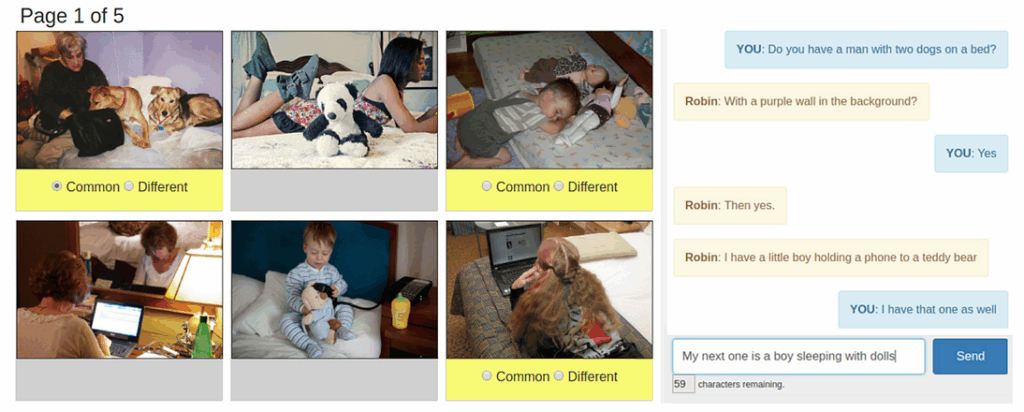 Moreover, the game consists of five rounds (hence the “Page 1 of 5” in top left), and in subsequent rounds some images can reappear again, which motivates the participants to make mutually referring descriptions of images. Therefore, this large-scale crowdsourced data collection allows the authors to not only have a good dataset for training but also make some conclusions on how people talk about images. Especially interesting conclusions deal with how the game changes over the five rounds: as the game progresses, utterances become much shorter, the fraction of nouns and content words increases significantly, but these words also begin to repeat themselves a lot, so there are fewer new nouns introduced in later rounds. This is exactly the “common ground” that is hard to capture for the conversational model.