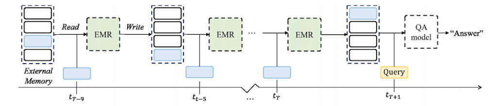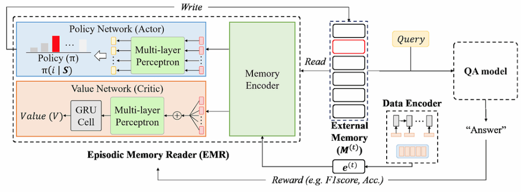 To do that, they propose using the Episodic Memory Reader, a question answering (QA) architecture that can sequentially read input contexts into an external memory, and when the memory is full, it decides what to overwrite there: