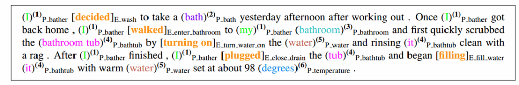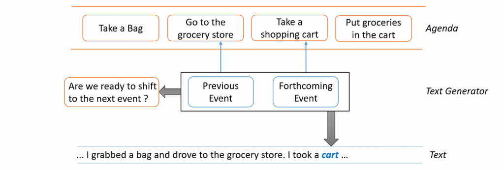 The model by Fangzhou et al. tries to generate coherent stories about daily activities. It has a symbolic text planning component where you write scripts that reflect standardized sequences of events about daily activities. A script is a graph that reflects how the story should progress. It contains events that detail these daily activity scenarios, and the corpus for training contains texts labeled (through crowdsourcing) with these events. Here is a sample data point: