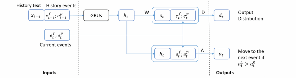 How do you implement all this? Actually, it’s rather straightforward: you use a language model and condition it on the embeddings of currently relevant events. Here is the general scheme: