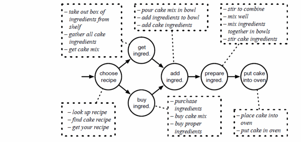 This kind of labeling is hard, so, naturally, the labeled dataset is tiny, about 1000 stories. Another source of data are the temporal script graphs (TSG) that arrange script events according to their temporal and/or causal order. Here is a sample TSG for baking a cake: