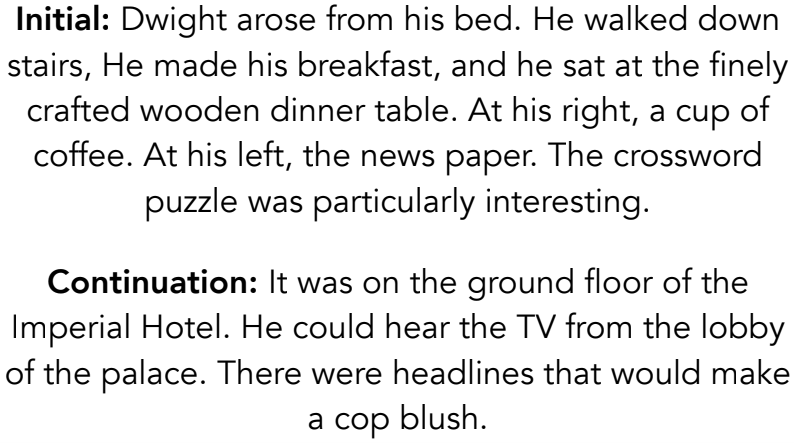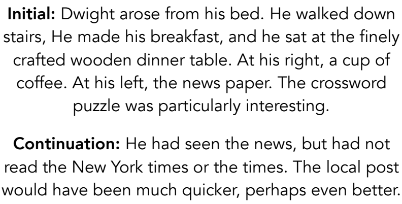 Seed (text provided for the model): In a shocking finding, scientist discovered a herd of unicorns living in a remote, previously unexplored valley, in the Andes Mountains. Even more surprising to the researchers was the fact that the unicorns spoke perfect English.