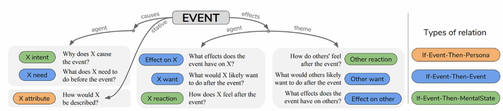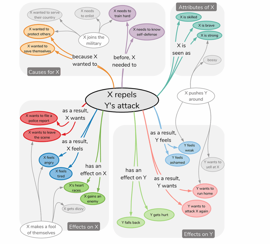 One way to proceed would be to devise models that extract the intent of the speaker from an utterance — finding the reason for the utterance, the desired result, the effect that this might have on the other speakers etc. This work is already underway in Prof. Choi’s lab and they have published a very interesting paper related to it called ATOMIC: An Atlas of Machine Commonsense for If-Then Reasoning. It contains an actual atlas (you could call it a knowledge base) of various causes, effects, and attributes. Here is a tiny subset: