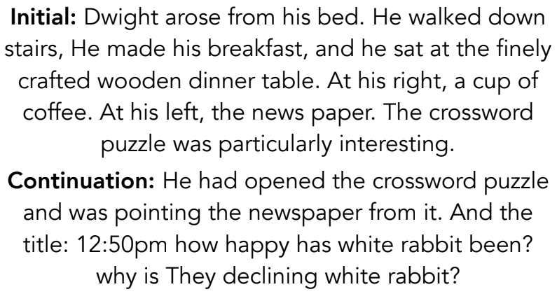 This happens because current language models do not work well on the long tail of all words. One uncommon word generated at random from the long tail, and everything breaks down. One way to fix this is to use top-k sampling, i.e., sample randomly but only from the best k options. In our experiments, we no longer get any white rabbits and the text looks coherent enough: