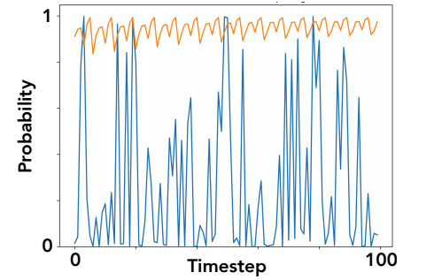 What’s up? Is there a bug? Should we use a bigger beam? Wider, longer? Nope, larger beams don’t help. You can try it for yourself. If you compare human language and machine-generated language, you will see that the conditional probabilities of each subsequent topic are very high for machine-generated texts (beam search is the orange line below) but this is definitely not the case for humans (blue line):