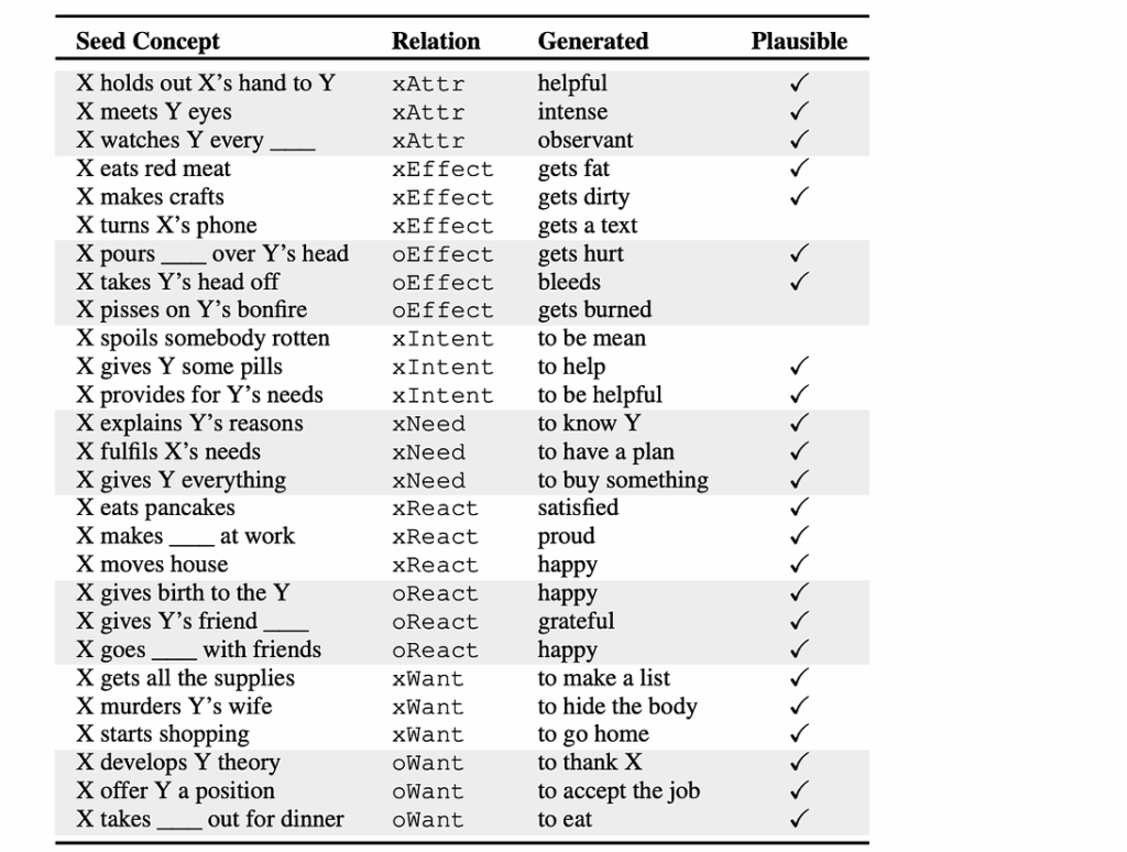 The result is a paper called “COMET: Commonsense Transformers for Automatic Knowledge Graph Construction”. With a Transformer-based architecture, the authors produce a model that can even reason about complex situations. Here is a random sample of COMET’s predictions, with the last column showing human validation of plausibility: