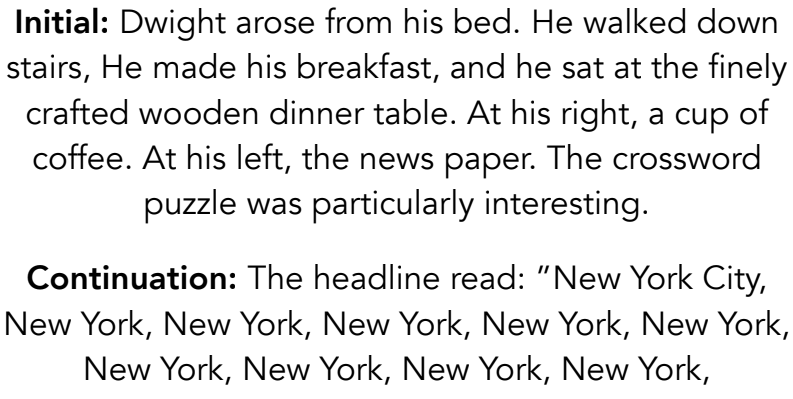 The same effect happens in conversational models. The famous “I don’t know. I don’t know. I don’t know…” answer that plagues many dialogue systems actually has a very high likelihood of occuring, and it gets more probable with each repetition! The loop somehow reinforces itself, and modern attention-based language models easily learn to amplify the bias towards repetition.