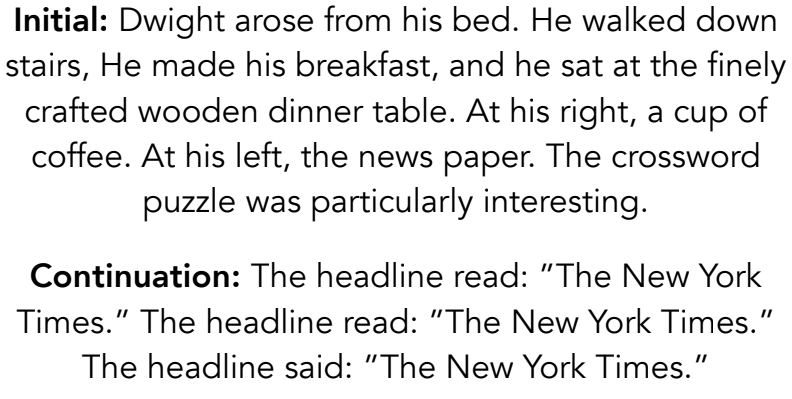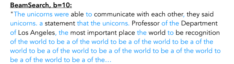 We had never seen neurally generated text of this quality, but note that it still took 10 tries to generate, and there was some random sampling that led to these 10 different tries. If, however, we use beam search instead of random sampling for generation, we get a much stranger text that soon degenerates into a closed loop: