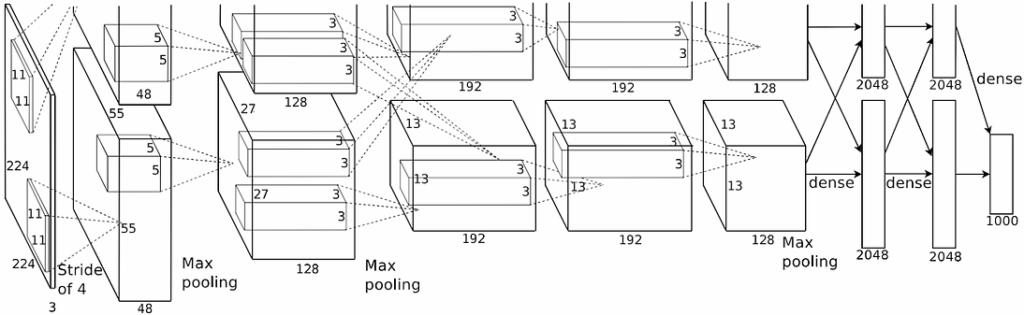 The deep learning revolution came to computer vision in 2010–2011, when researchers learned to train neural networks on GPUs. This significantly expanded the possibilities of deep CNNs, allowing for much deeper networks with much more units. The first problem successfully solved by neural networks was image classification. A deep neural network from Jurgen Schmidhuber’s group (Ciresan et al., 2011) won a number of computer vision competitions in 2011–2012, beating state of the art classical solutions. But the first critically acclaimed network that marked the advent of deep learning in computer vision was AlexNet, coming from Geoffrey Hinton’s group (Krizhevsky et al., 2017), which won the ILSVRC 2012 competition on large-scale image classification based on the ImageNet dataset. It was a large network that fit on two GPUs and took a week to train.