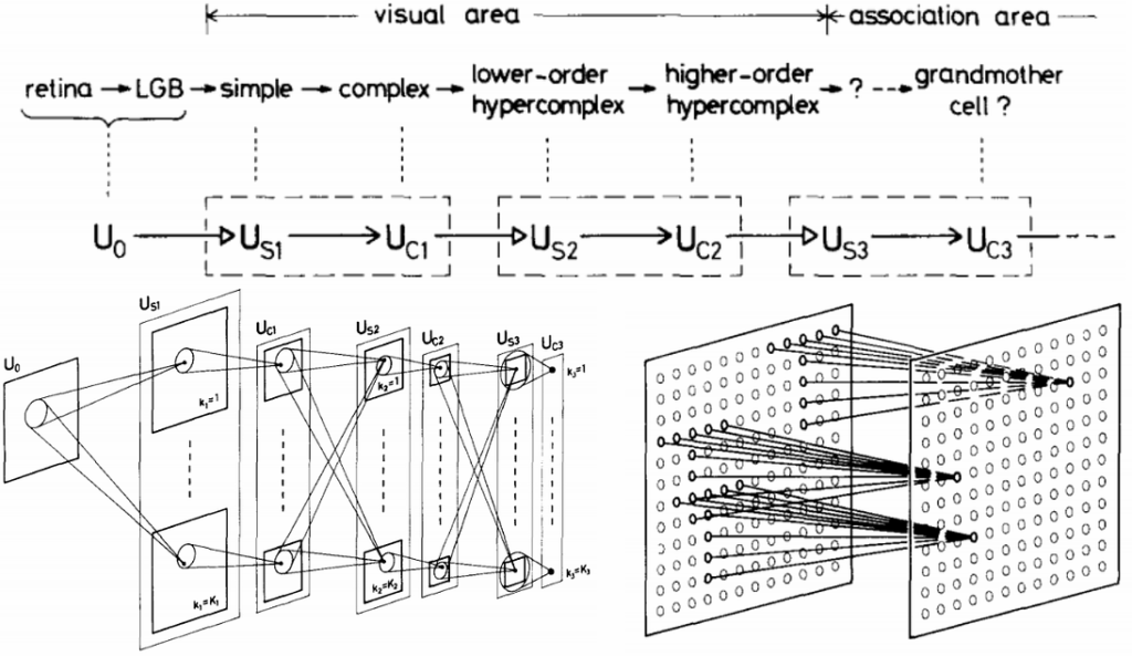 Current state of the art computer vision systems are virtually all based on convolutional neural networks (CNN). The idea of CNNs is very old: it was inspired by the studies of the visual cortex made by Hubel and Wiesel back in the 1950s and 1960s and implemented in AI by Kunihiko Fukushima in the late 1970s (Fukushima, 1980). Fukushima’s paper is extremely modern: it has a deep multilayer architecture, intended to generalize from individual pixels to complex associations, with interleaving convolutional layers and pooling layers (Fukushima had average pooling, max-pooling came a bit later). A few figures from the paper say it all: