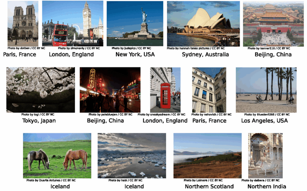 As a completely different sample image-related problem, consider geolocation, i.e., recognizing where a photo was taken based only on the pixels in the photo (no metadata). This requires knowledge of common landmarks, landscapes, flora, and fauna characteristic for various places on Earth. The PlaNet model, developed in Google, already did it better than humans back in 2016 (Weyand et al., 2016); here are some sample photos that the model localizes correctly: