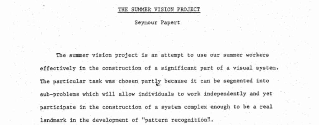 Computer vision is one of the oldest and most important fields of artificial intelligence. As usual in AI, it began with a huge understatement. In 1966, Seymour Papert presented the Summer Vision Project; the idea was to use summer interns in MIT to solve computer vision, that is, solve segmentation and object detection in one fell swoop. I’m exaggerating, but only a little; here is the abstract as shown in the memo (Papert, 1966):