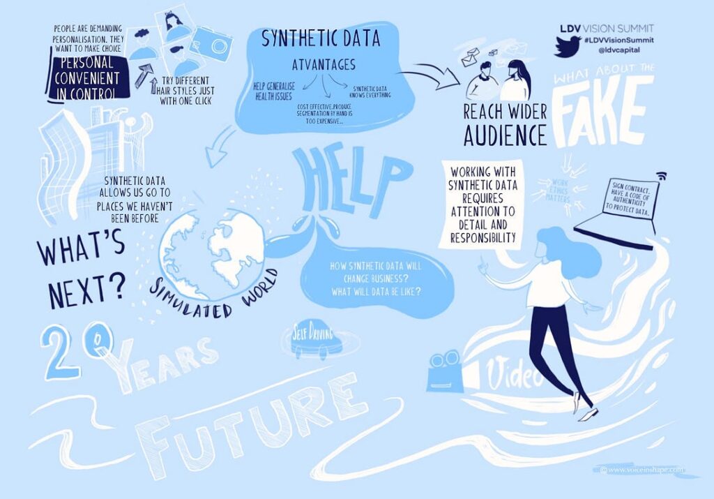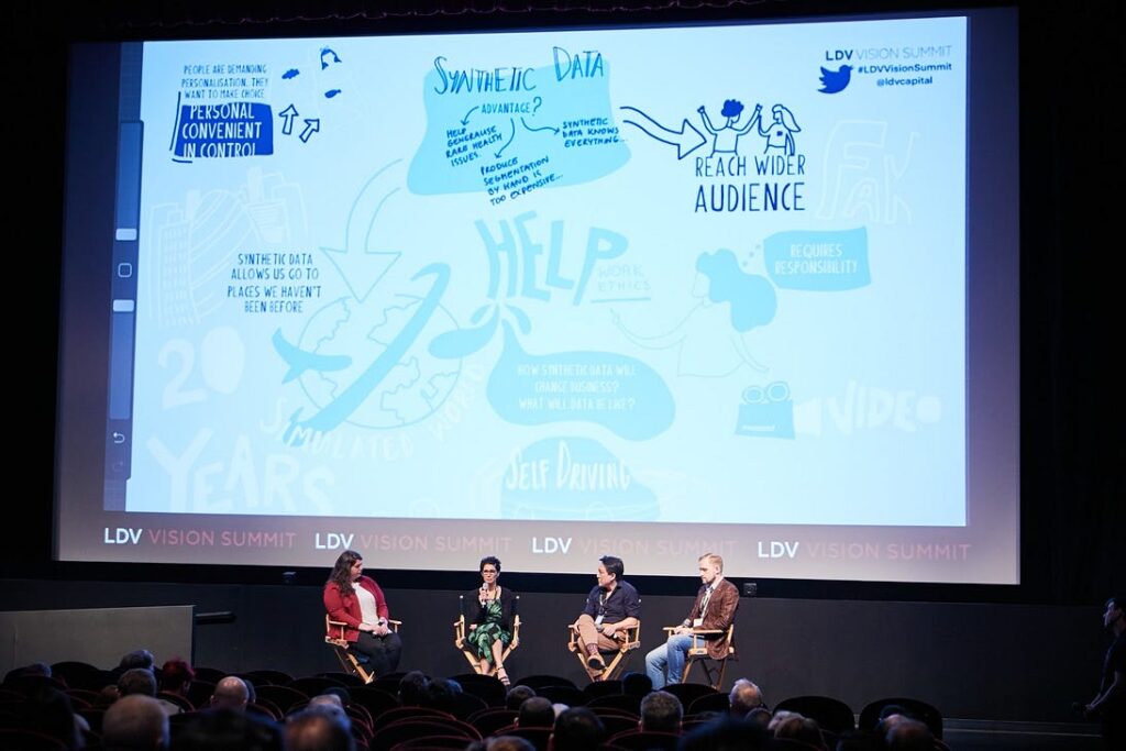 Interestingly, panel discussions at the LDV Vision Summit were accompanied by live illustrations: a hired artist was doodling along as the participants spoke. It looked very cool in the process, and here is what the result looked like for the synthetic data panel.