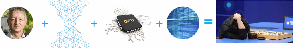 Neural networks did work in the mid-2000s, however. Results coming from the groups of Geoffrey Hinton, Yoshua Bengio, and Yann LeCun — they each had different approaches but were all instrumental for the success of deep learning — made neural networks go from being “the second best way of doing just about anything” (a famous quote from the early 1990s usually attributed to John Denker) to an approach that kept revolutionizing one field of machine learning after another. Deep learning was, in my opinion, as much a technological revolution as a mathematical one, and it was made possible by the large datasets and new computational devices (GPUs, for one) that became available in the mid-2000s. Here is my standard illustration for the deep learning revolution (we’ll talk about the guy on the right later):