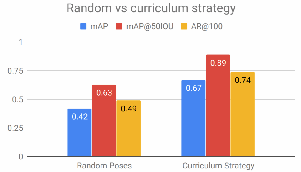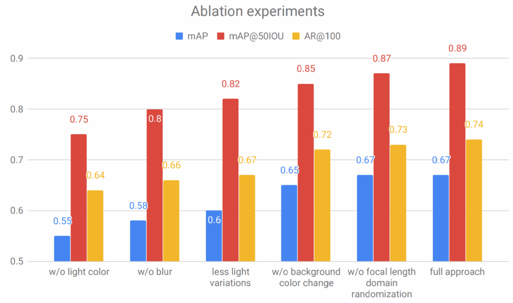 Next we present our key results that were achieved with the synthetic training data in several different attempts at closing the domain gap. We present a comparison between 5 different setups: