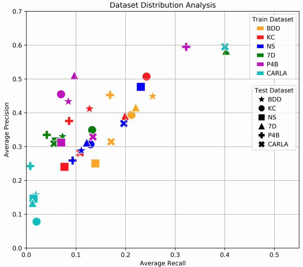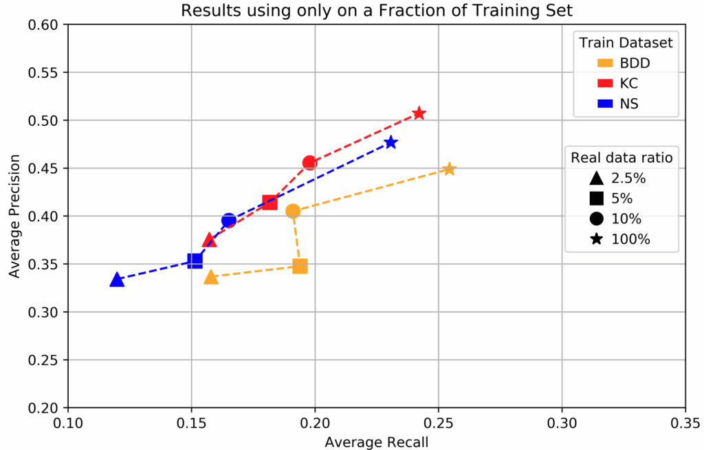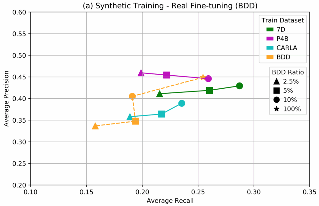 Second, note the “fine-tune” bars that exhibit (quite significant) improvements over other models trained on a different domain. This is another effect we have noted in our experiments: it appears that fine-tuning on real data after pretraining on a synthetic dataset often works better than just training on a mixed hybrid syn-plus-real dataset.