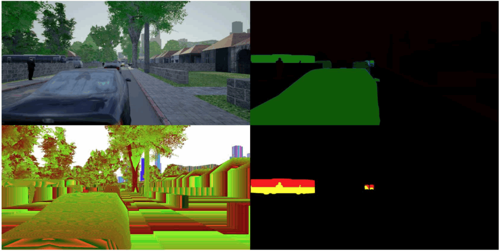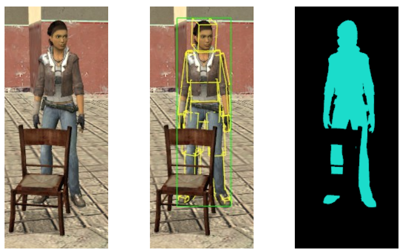 Anyway, the point of both Garry’s Mod and its use in Bochinski et al. is that Source has a very capable physics engine, and even more than that, it supports scripting for bots, both human and vehicles. Thus, it is relatively easy to create a simulated world for urban driving applications, complete with humans, cars, and surveillance cameras placed in realistic positions. Bochinski et al. extended the engine to be able to export bounding boxes, segmentation, and other kinds of labeling: