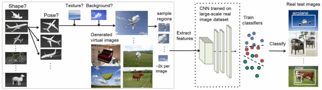 Therefore, my story of synthetic data for object detection could not begin earlier than the first deep learning models for this problem… but it does not begin much later either! Our first paper in this review is by Peng et al., called “Learning Deep Object Detectors from 3D Models”; it came out on ICLR 2015, and the preprint is dated 2014.