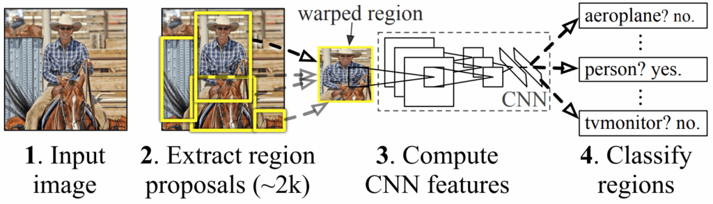 R-CNN is the most straightforward two-stage object detection architecture you can think of: bounding box proposals are produced by an external algorithm (the staple of the era, selective search by Uijlings et al.), and then each proposal goes through a convolutional network (CNN) for classification, with a separate model confirming whether the proposal actually does contain an object (because algorithms like selective search always produce a lot of false positives before you can be sure the real objects are covered). Like this: