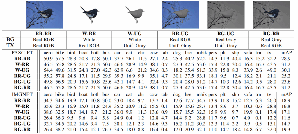 They used AlexNet pretrained on ImageNet as a feature extractor, and trained classifiers on features extracted from region proposals, just like R-CNN. Then they started testing for robustness to various cues, producing different synthetic datasets and testing object detection performance on a real test set after training on these datasets. Here is a sample table of results from their paper.