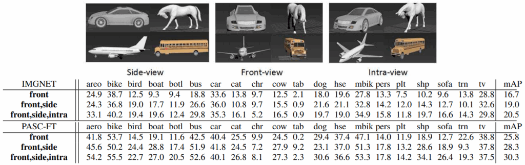 The absolute numbers in these tables did not really represent state of the art in object detection even in 2015, and are definitely not relevant today. But conclusions and comparisons show an important trend that goes through many early results on synthetic data for computer vision: for many models, the details and textures don’t matter as much since the models are looking for shapes and object boundaries. If that is the case for your model, then it is much more important to have a variety of shapes and poses, and textures can be left as an afterthought.