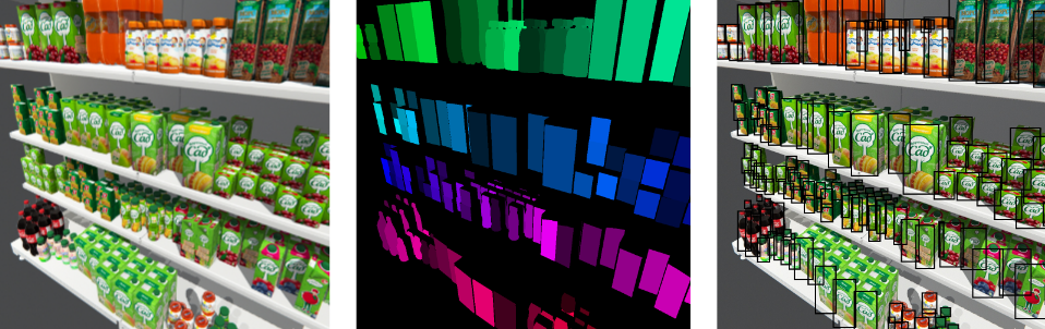 • second, the resulting data is perfectly labeled, as we are in full control of the 3D scene; moreover, we can produce labeling which we would not be able to produce by hand: we know the exact distance from the camera to every object, the angles each bottle and each carton of juice are turned by, and so on.