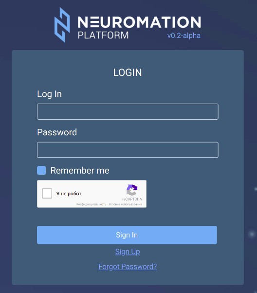 We have wrapped the DEX model into a docker container and uploaded in to the NeuroPlatform. Let’s get started! First, enter Neuromation login page https://mvp.neuromation.io/