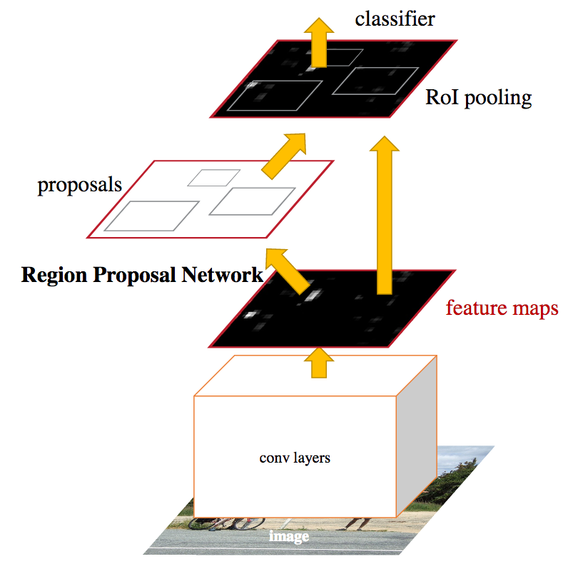 The idea is that the first (nearest to input) layers of a CNN extract universal features that could be useful for everything, including region proposals. On the other hand, the first layers have not yet lost all the spatial information: these features are still rather “local” and correspond to relatively small patches of the image. Thus, RPN uses precomputed feature values from early layers to propose regions with objects for further classification. RPN is a fully convolutional network, and there are no fully-connected layers in the RPN architecture, so the computing overhead is almost nonexistent (10ms per image), and we can now completely remove the region proposal algorithm!