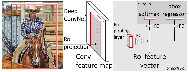 The main problem of R-CNN was speed, so when researchers from Microsoft Research rolled out an improvement there was no doubt how to name the new model: Fast R-CNN was indeed much, much faster. The basic idea (we will see this common theme again below) was to put as much as they could directly into the neural network. In Fast R-CNN, the neural network is used for classification and bounding box regression instead of SVM: