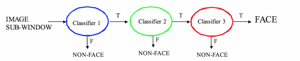 The third, final idea is to combine the classifiers into a cascade. Thing is, even boosted classifiers still have too much false positives. A simple 2-feature classifier can achieve almost 100% detection rate, but with a 50% false positive rate. Therefore, the Viola-Jones algorithm uses a cascade of gradually more complex classifiers, where we can reject a bounding box on every step but have to pass all checks to output a positive answer: