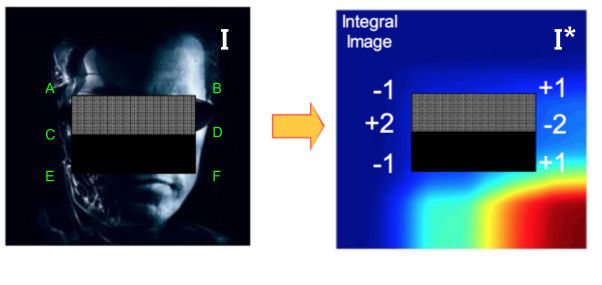 Haar features for this filter could be computed in just a few operations. E.g., the horizontal Haar filter activation shown on the Terminator’s face equals 2C — 2D + B — A + F — E, where the letters denote intensities at the corresponding points on the integral image. We won’t go into the formulas but you can check it yourself, it’s a good exercise for understanding the transform.