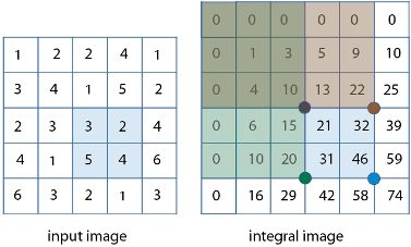 The main property of these filters is that they can be computed across the entire image very quickly. Let us consider the integral version (I*) of the original image (I); the integral version is the image where intensity at coordinate I*x,y is the total intensity over the whole rectangle that begins at the top left corner and ends in (x,y):