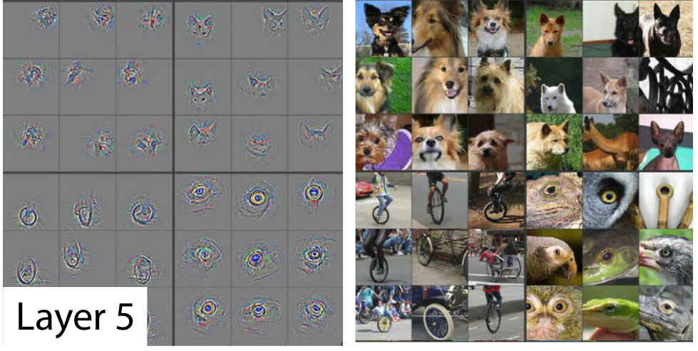 One idea is to simply look for the images that activate specific neurons with the hope that they will have something in common. This idea was developed, among other works, in the famous paper “Visualizing and Understanding Convolutional Networks” by Zeiler and Fergus (2013). The following picture shows windows from actual images (on the right) that provide the largest possible activations for four different high-level neurons together with their pixels that contribute to these activations; you can see that the procedure of fitting images to features does produce readily interpretable pictures: